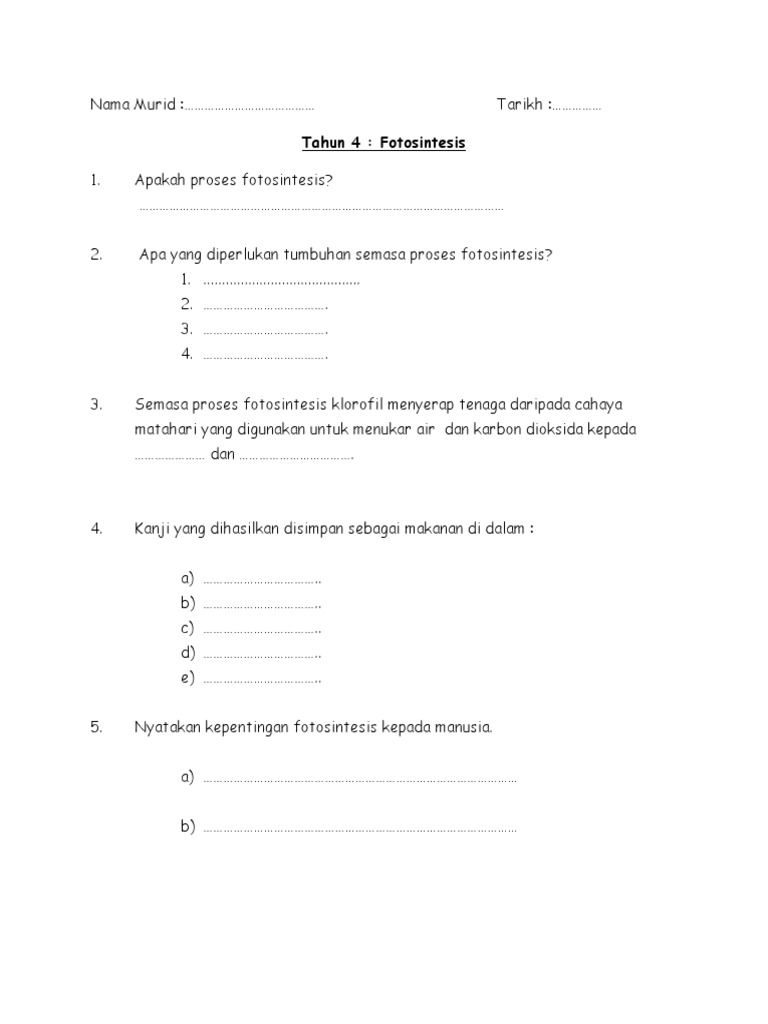 Soalan Fotosintesis Tahun 4. 1) apakah maksud fotosintesis a) proses haiwan membuat makanan sendiri b) proses tumbuhan membuat makanan sendiri c) proses manusia membuat makanan 2) nyatakan keperluan proses fotosintesis a) cahaya matahari, klorofil dan air b) karbon dioksida, cahaya matahari dan klorofil c) cahaya matahari, karbon. Resepi roti jala dapur tanpa sempadan;