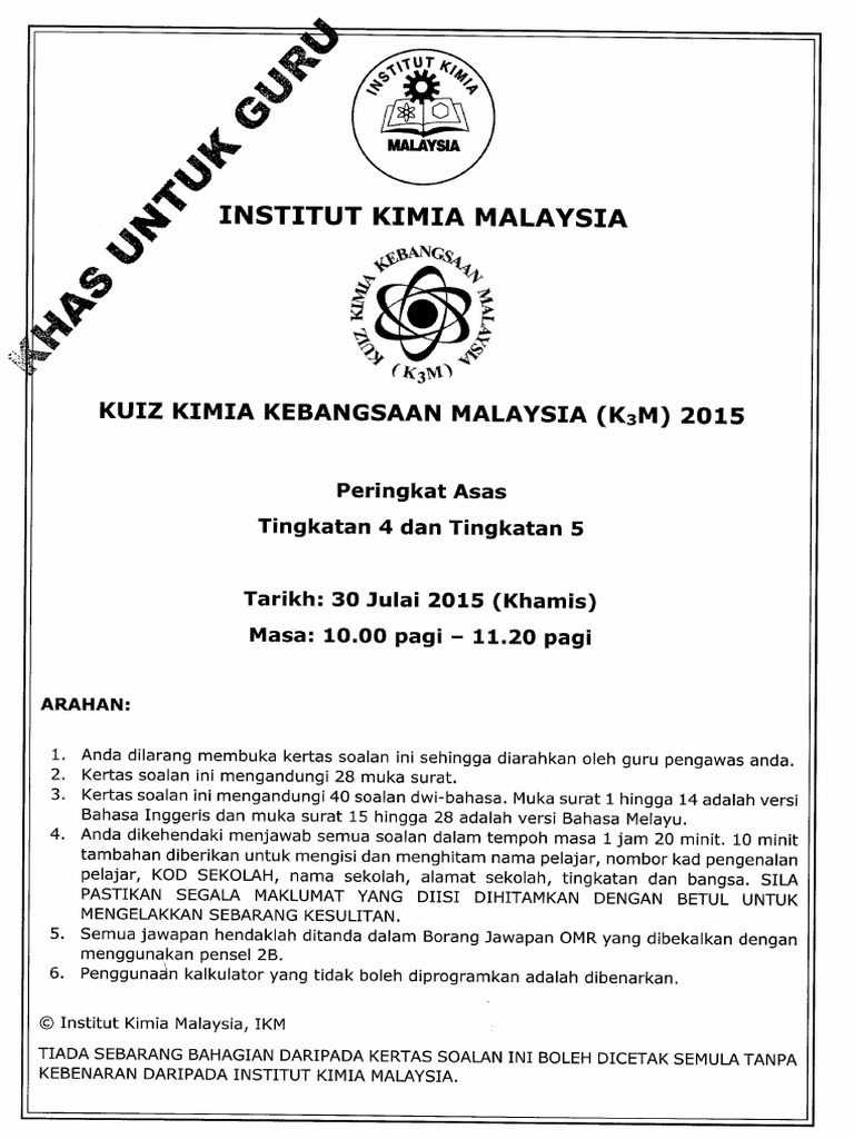 Kuiz kimia kebangsaan malaysia (k 3 m) 2016 anjuran institut kimia malaysia (ikm) dengan kerjasama kementerian pendidikan malaysia. Institut kimia malaysia dengan kerjasama kementerian pendidikan malaysia melalui panitia kimia smk syed sirajuddin. Kuiz kimia kebangsaan malaysia (k3m) 2019 at participating schools nationwide. Kuiz kimia kebangsaan malaysia (k3m) 2021, 5 august 2021.