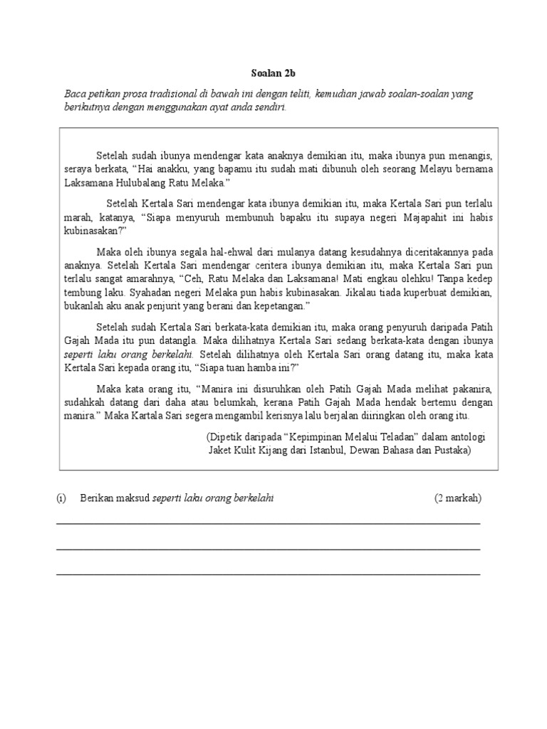 Jawapan soalan 2 c prosa tradisional -kepimpinan melalui tauladan soalan peperiksaan percubaan lahad datu sarawak 2016- irdina batrisia- kelas 4. Prosa Tradisional Kepimpinan Melalui Teladan Soalan Jawapan.