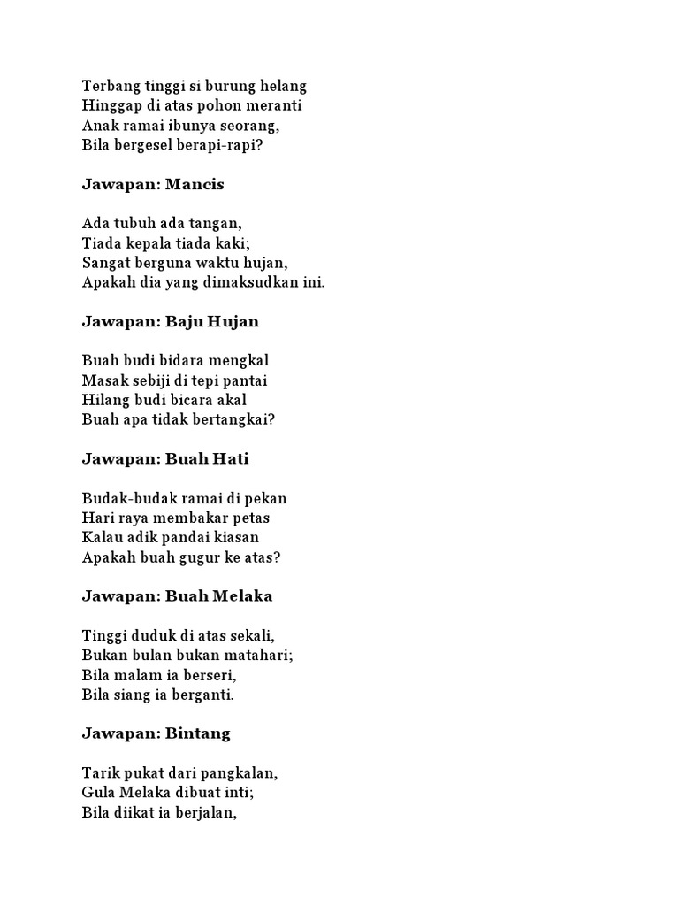 Unduh sebagai DOCX PDF TXT atau. Sekarang kami ingin beritahu bahawa kami telah publishkan satu artikel yang sangat berguna untuk guru-guru cetak iaitu Contoh Teka Teki Pantun Dan Jawapan.