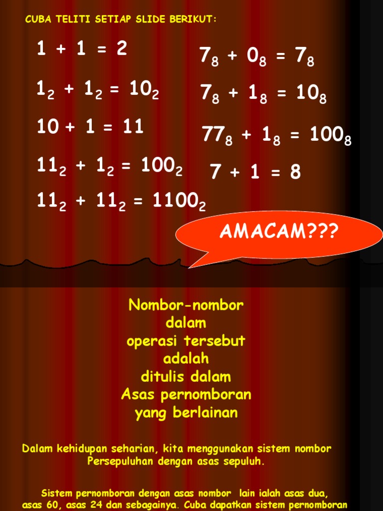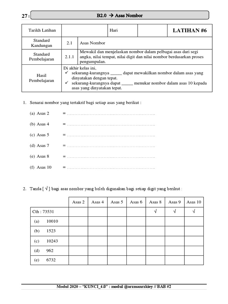 ASAS NOMBOR Number Bases Kertas 1 SPM 2 soalan 2markah BIL SUBTAJUK ms 11 Nombor Dalam Asas Dua 1 12 Nombor Dalam Asas Lapan 4 13 Nombor Dalam Asas Lima 5 14 Menukar Nombor Dalam Asas Sepuluh Ke Asas Dua Lapan atau Lima 7 15 Menukar Mana-mana Di Antara Nombor Dalam Asas Dua Lapan atau. Soalan Dan Jawapan Asas Nombor. Soalan Matematik Asas Nombor.